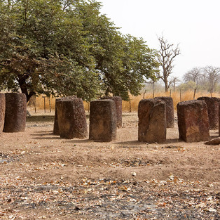 En GAMBIE, près du village de Wassu (13.691716N, 14.873086W) donc, ce sont 11 cercles mégalithiques qui sont posés là .... Sculptés et taillés dans de la "Latérite"(sol ou roche riche en Fer et en Aluminium de couleur rougeâtre sous l'action du soleil et des éléments), certains piliers mesurent plus de 2m et dépassent les 5 Tonnes! .... Les cercles sont disposés sur 2 rangées, une de de 4 et l'autres de 7 cercles, et chaque cercle présente une dizaine de Pierres avec des diamètres variants de 4 à 6m.